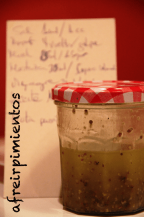 Esta vinagreta (sin la fruta de la pasión) la hago muchísimo; queda bastante rica… Mucha gente me ha pedido antes la receta, que siempre hacía a ojo, y que ahora me he visto en la obligación moral de medir. Para ello, desde mi vida bloguera estoy concienciándome con el tema medidas, me agencié unas cucharillas medidoras (1, 5, 15 y 100 ml) y el peso está al caer.