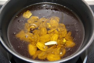 En una cazuela ponemos todas las pieles, salvo 8 tiritas que reservamos para emplatar, y las cubrimos con, aproximadamente, la mitad del aceite de ajo. Confitamos las pieles a baja temperatura, 80ºC, para que vayan soltando toda la gelatina que nos montará el pil pil; 30 minutos serán suficientes.