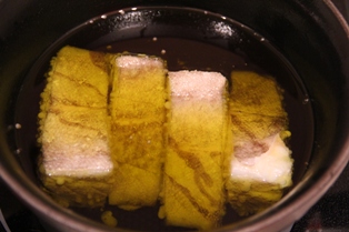 Una vez confitadas las pieles escurrimos el aceite con toda la sustancia que ha soltado el bacalao. Veremos dos fases, por encima quedará el aceite y por debajo una maravillos gelatina blanca.