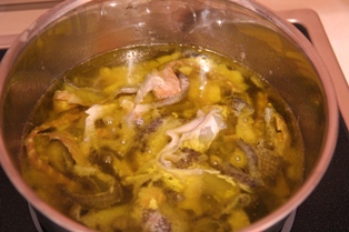 En la cazuela donde vayamos a montar el pil pil echamos una buena cantidad del aceite y gelatina y con la ayuda de una varilla vamos montando a fuego muy suave. Con este método, confitando las pieles, no nos hará falta el truco de montar con un colador; de hecho hay que llevar cuidado para que no monte demasiado. Si somos muy enérgicos con el aceite frío es posible que monte demasiado y obtengamos una gelatina demasiado espesa…