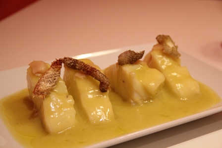 En una cazuela disponemos las tajadas de bacalao con la piel hacia arriba (importante). Cubrimos con el aceite de ajo (el que no se ha usado para confitar las pieles) y confitamos el bacalao a 80ºC hasta que esté hecho. Ésto lo vemos porque las lascas del bacalao comienzan a separarse, aproximadamente unos 10-12 minutos. Escurrimos bien del aceite.