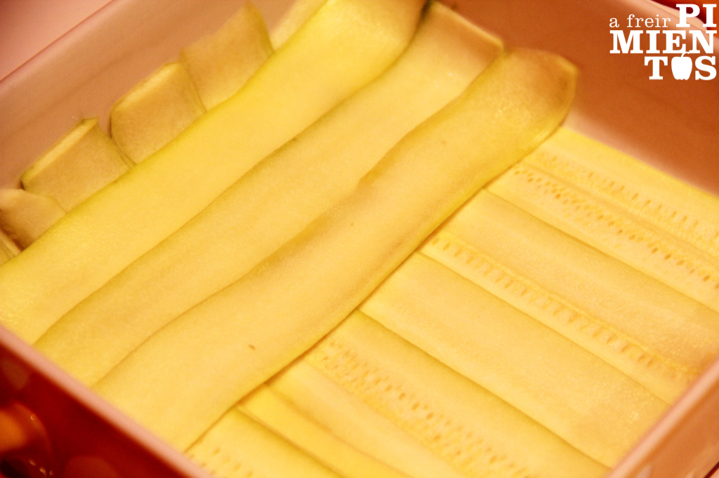 Con un pelador hacemos lo propio con los calabacines previa amputación de sus extremos. Ojo, trampa para osos, Marián atenta, viene la complicación extrema de la receta: con la ayuda del mismo pelador hacemos láminas de calabacín: sí, es posible. Sujetad el calabacín y, a lo largo, pasad el pelador ejerciendo una leve presión hacia abajo, tirad hacia vosotros. Sacad láminas hasta que veáis aparecer las semillas, entonces giráis 90º el calabacín y repetís el proceso; otra vez y luego otra.