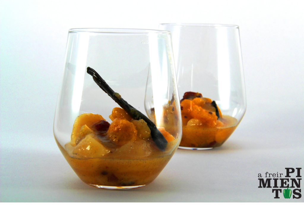 Preparación abierta a jugar con las variedades de peras y manzanas (en función de como os guste que quede la mordida); a introducir pasas, orejones, higos secos,… a regar con algún licor; cambiar el limón por lima… En definitiva a divertiros dando vuestro toque, acomodando vuestros gustos y teniendo en cuenta a vuestros clientes (madres cerrar las licoreras).