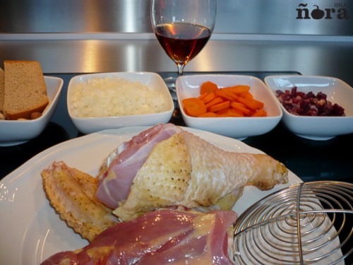 Sofreímos el pollo, lo sacamos y posteriormente freímos la cebolla, añadiremos la zanahoria que teníamos pelada y en rodajas y le damos unas  vueltas, a continuación añadimos el jamón. Después volvemos a poner el pollo en la olla, le añadimos el brandy movemos bien  y dejamos que se evapore el alcohol.