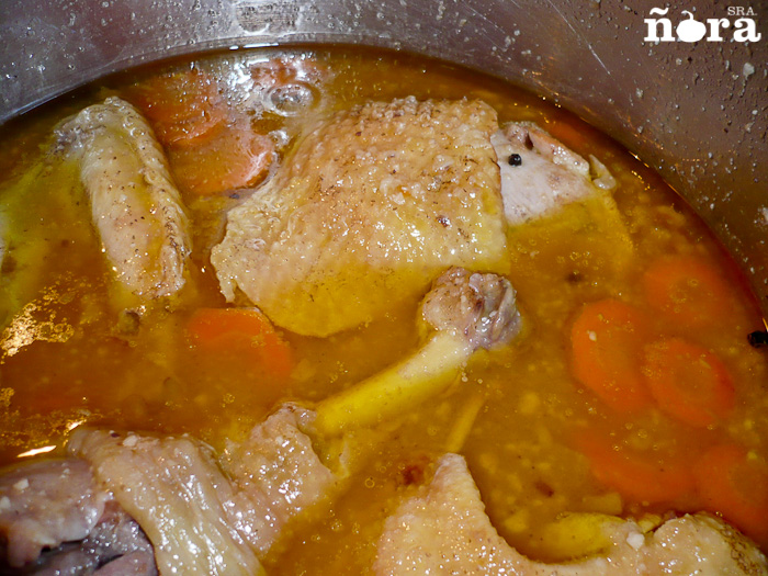 Incorporamos la picada del mortero. Añadimos agua, las especias, probamos de sal  y lo ponemos a guisar el tiempo necesario según el tipo de pollo.