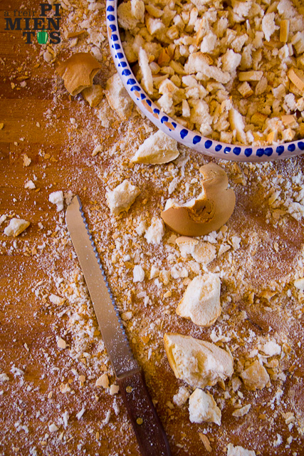 Hacer migas el pan. Las migas han de ser pequeñas y sin corteza. Si el pan está duro es mucho más fácil. Es importante hacer esto en grupo, con un poquito de vino de por medio: es un coñazo, pero hermana. Humedecer las migas sin llegar a empaparlas y tapar con un paño. Es importante que queden húmedas para que el plato no quede seco.