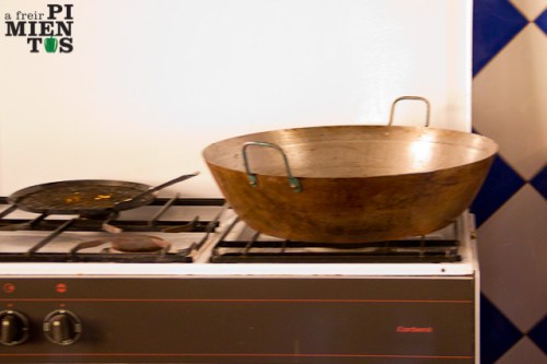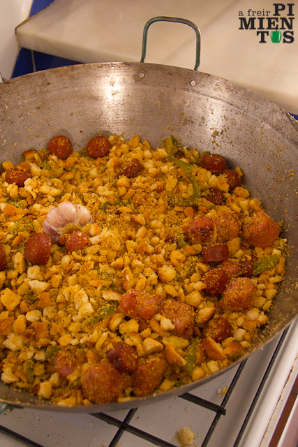 En una sartén, que habrá de ser grande, cubrimos el fondo aceite (hay que ser generosos que luego el pan bebe mucho, casi un dedo una vez caliente) y añadimos los ajos. Cuando el aceite tome temperatura incorporamos el pimiento y lo freímos hasta que esté blando. En este momento echamos un par de cucharaditas de pimentón y damos unas vueltas para que no se nos queme. Añadimos las migas y, a partir de ese momento, lo más importante es no dejar de remover con la rasera en ningún momento. Cansa, pero luego las caras de los amigos te harán sentir que ha merecido la pena.