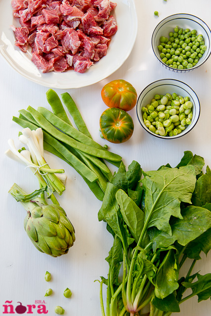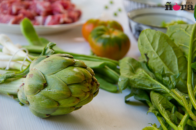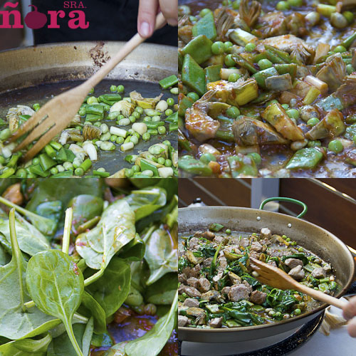 Ponemos el aceite en la paella y sofreímos la carne, sazonamos y cuando la hemos marcado la retiramos. Añadimos las verduras, a excepción de las espinacas, le damos unas vueltas para que sofría; salamos. Echamos el tomate y freímos; cuando esté incorporamos las espinacas.