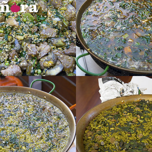 Put olive oil in paella pan and brown meat. Take out of the pan and reserve. Add vegetables, except spinach, and saute. Add salt. Add tomate and stir until it’s fried. Add spinach and when they reduce add meat, salt and recover meat. Stir a few times and add rice and saffron. Let it saute for few minutes stirring often to mix all flavors. Add hot water (double of rice volume) salt and stir to evenly distribute rice on paella pan. Rise heat fist 5 minutes and then return to medium. Should be cooked in 18 to 20 minutes. Once cooked cover with newspaper and let rest for 5 minutes before serving.