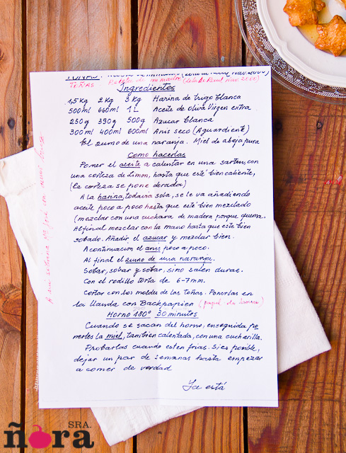 La receta que yo tengo de la abuela Mercedes es igual pero no lleva ni zumo de naranja ni corteza de limón. Otra cosa: es mejor guardarlas sin bañar para evitar que se rompan porque se han pegado. Yo doy el baño en miel justo antes de comerlas.