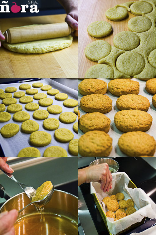 Cuando se sacan del horno, todavía calientes, las iremos bañando en miel  caliente y las colocaremos en una lata.