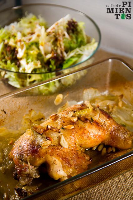 Hornear a 180º durante 35-40 minutos dando la vuelta a la carne transcurrido 20 minutos. Es conveniente comenzar el asado con la piel contra el fondo de la fuente para que al final, una vez le hemos dado la vuelta, quede hacia arriba y se tueste bien. Si fuera necesario en el último momento para rematar el asado subir el horno (o incluso la fuente de nivel) para que la piel quede bien dorada.