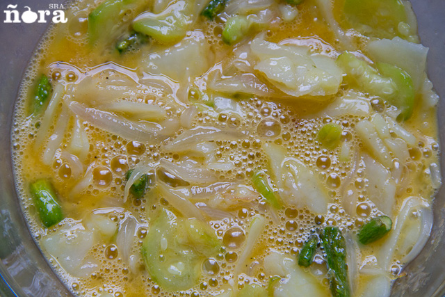 Cuando la verdura ha soltado todo el aceite la introduzco en el huevo batido, añado sal y pimienta, remuevo y lista para cuajar.