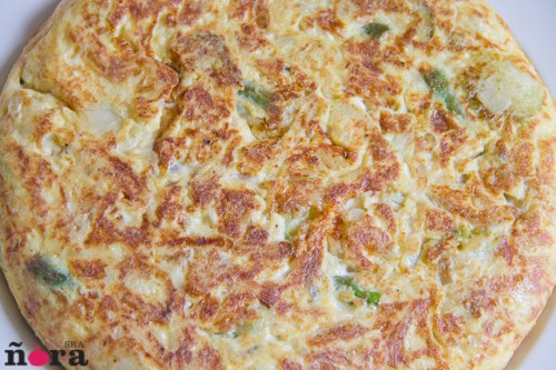 Hoy he preparado una muy jugosa. La de cebolla, patata y calabacín es de las mejores; pues hoy además le hemos añadido unos trigueros y la hemos acompañado con una morcilla negra de mi pueblo. Una mezcla excelente.