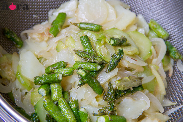Ponemos abundante aceite a calentar y cuando esté bien caliente añadimos todas las verduras que teníamos reservadas; patatas, cebolla, calabacín y espárragos por este orden.