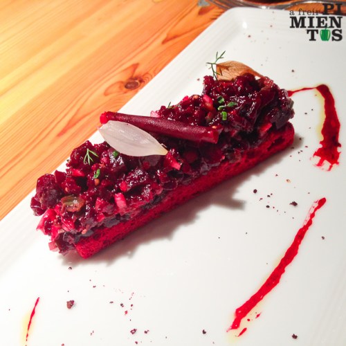 La cocina corre a cargo de Kiko Moya, el menos visible en la sala y al que pudimos conocer el domingo pasado. No tengo una palabras para definir la cocina de Kiko, pero algunos de los adjetivos que se me ocurren son: extensa, sin renuncias, de raíces, local, meditada y fundamentada, sincera,… Todos los palos que toca, y no se deja uno, los borda, tanto los de producto como los de cocina (por usar sus propias palabras). Nos encanta la convivencia perfecta que existe entre sus platos y propuestas. Poder tomar una de las mejores gambas rojas del país, unos arroces de quitar el hipo así como un ojo de pez (foto más adelante) o un tártaro de remolacha, platos verdaderamente sorprendentes. Personalmente siento predilección por sus pescados: impresionantes.