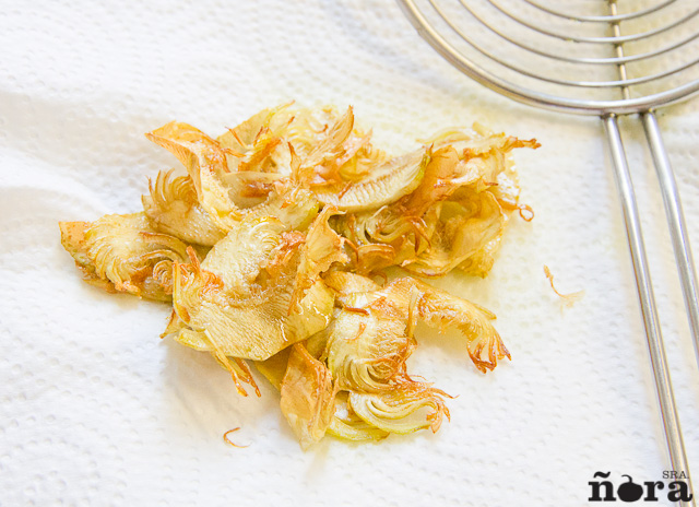 Ponemos abundante aceite en la sartén y las freímos con mucho cuidado. Cuando están crujientes las ponemos a escurrir en un colador y a continuación las pasamos a papel absorbente. Lo importante es que las alcachofas no se empapen de aceite, pues perderían la consistencia que queremos darles.