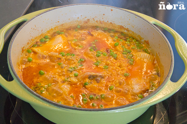 Echamos el arroz , le damos unas vueltas e incorporamos el caldo. Le añadimos la sal y el azafrán. Pasados 10 minutos añadimos la raya que teníamos reservada y los guisantes, se mueve la cazuela para que se integre el pescado y dejamos cocer unos 8 minutos más. Pasado este tiempo lo apartaremos del fuego, to tapamos y dejamos reposar 5 minutos.