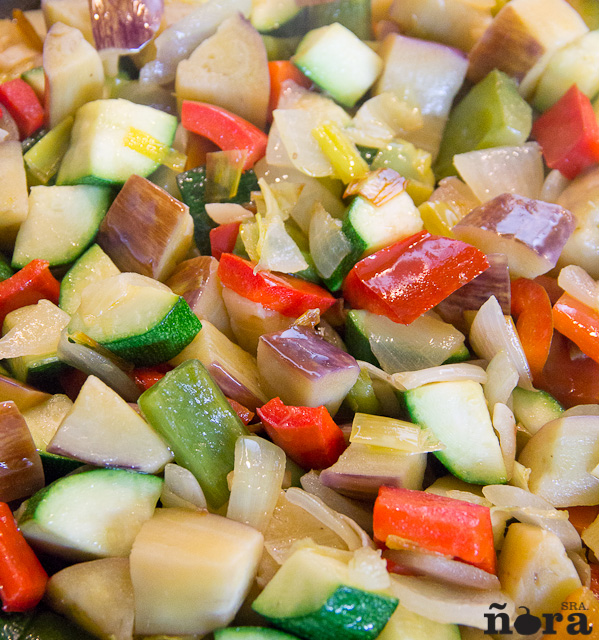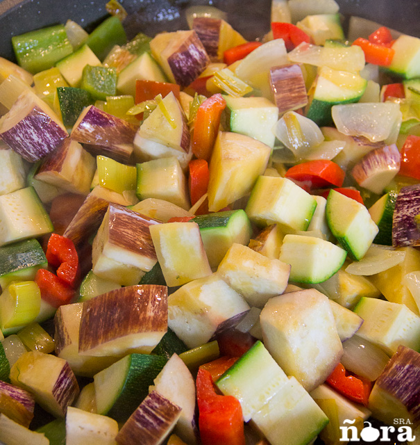 Ponemos el aceite en la sartén, cuando esté caliente echamos la cebolla y el puerro, damos unas vueltas y añadimos el pimiento, el calabacín y las berenjenas.