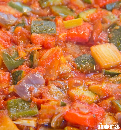 Otra receta más para aumentar mi «fanatismo» por la srañora. Mi abuela hace «conservas» de pisto más o menos con esta receta con las verduras de su huerto. Cada vez que vamos a su casa hago acopio de botes. Es decir, yo paso diréctamente al último punto de la receta. Con un poco de suerte alguna vez ha coincidido con el acopio de albóndigas congeladas de mi suegra y el resultado ha sido apoteósico.