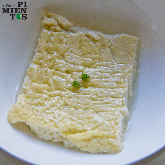 Hay que engrasar con mantequilla el recipiente. Vertemos la mezcla de la royale hasta cubrir un espesor de unos 5-7 mm. Hornear a 165 ºC. Dependiendo del método elegido y la superficie tardará más o menos; en 20-30 minutos debería estar listo. En cuanto un cuchillo salga limpio estará listo. Sacar y dejar enfriar. En caso de que sea necesario cortarla y llevarla al un segundo bowl es importante que esté fría. No es especialmente sugerente, pero está buena y funciona muy bien en el conjunto del plato.