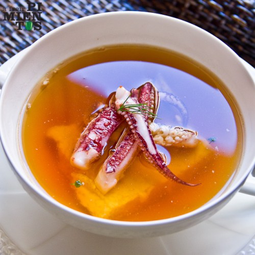 En mi opinión es una combinación genial. El caldo es potente, profundo. La royal lo aligera y aromtiza con la frescura del hinojo. Las patas de calamar contrastan por su textura y la inyección de sabor. Y, al menos para mi, el toque del aceite de guindilla o tabasco queda espectacular. Al estar muy localizado no lo notas en todas las cucharadas, sólo a veces. Una pasada que sólo se le podía ocurrir a un genio de los fogones.