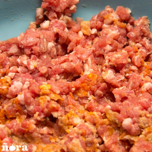 1.- Ponemos las carnes picadas en un bol. Los distintos colores evidencian los tipos de carne.