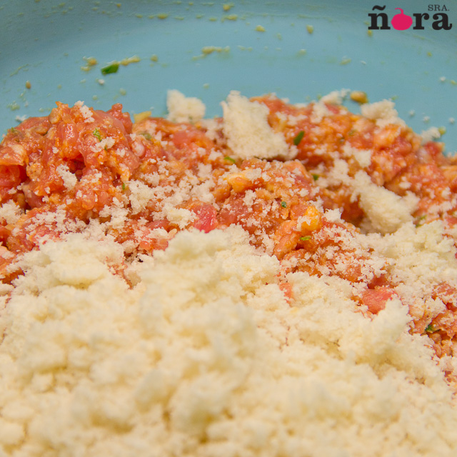 4.- Incorporamos la miga de pan desmenuzada como vemos en la foto y la integramos en la mezcla.