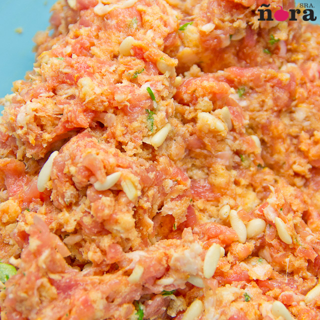 3.- A continuación añadimos los huevos y lo mezclamos todo. La textura de esta mezcla nos orientará sobre la cantidad de miga de pan que admite.