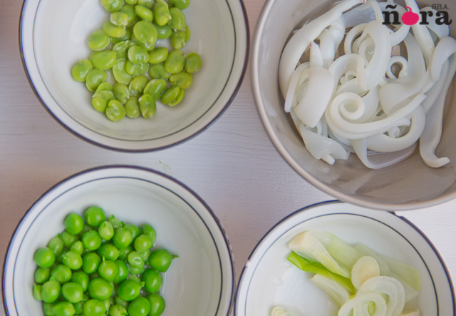 Pelar las habas y los guisantes y reservar. Cortar la cebolleta en aros finos. Preparar las patatas en cuadrados de 1 cm aproximadamente.