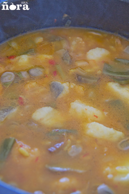 Poner el aceite en la olla y cuando esté caliente marcar un poco el bacalao, teniendo cuidado de no quemar la harina. Cuando este listo retiramos de la  olla y reservamos. En ese mismo aceite comenzamos a echar las verduras en el orden descrito anteriormente sin esperar a que a que se sofrían del todo. Deben quedar al dente, pues tienen que hervir  con el arroz.