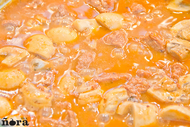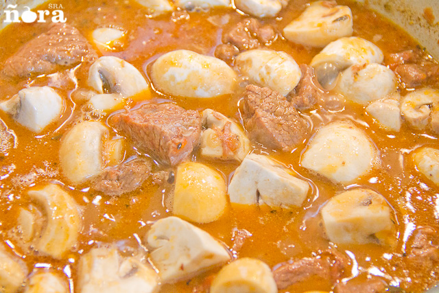 Tapar la cazuela y mantenerla a fuego suave durante 1 hora y 1/2 o hasta que al pinchar la carne este tierna. Cuando este en su punto, añadir los champiñones pelados y cortados en cuartos y cocer unos 15 minutos mas.