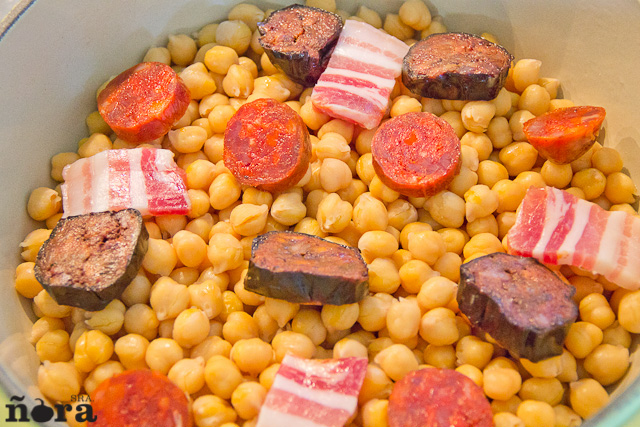 En la cazuela donde tenemos los garbanzos repartimos por encima en rodajas el chorizo, la morcilla y el tocino. Cubrimos con el caldo y esperamos a tener el sofrito que haremos a continuación.