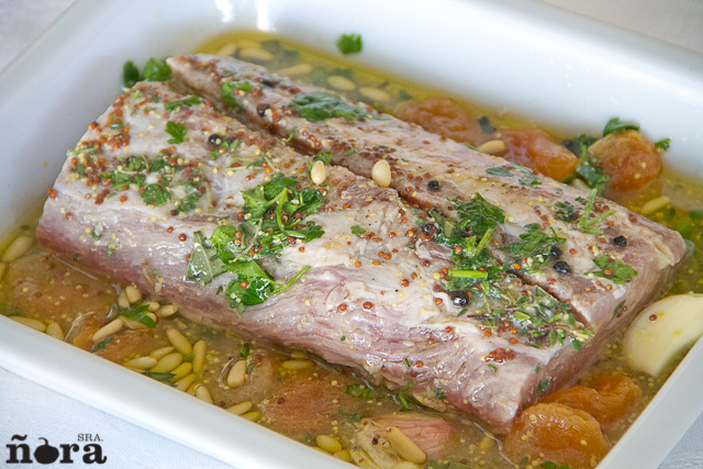 A primera hora de la mañana ponemos todos los ingredientes del adobo en un bote y los agitamos, salpimentamos el lomo de cerdo y lo sumergimos en este caldo hasta el momento de preparar nuestra receta.