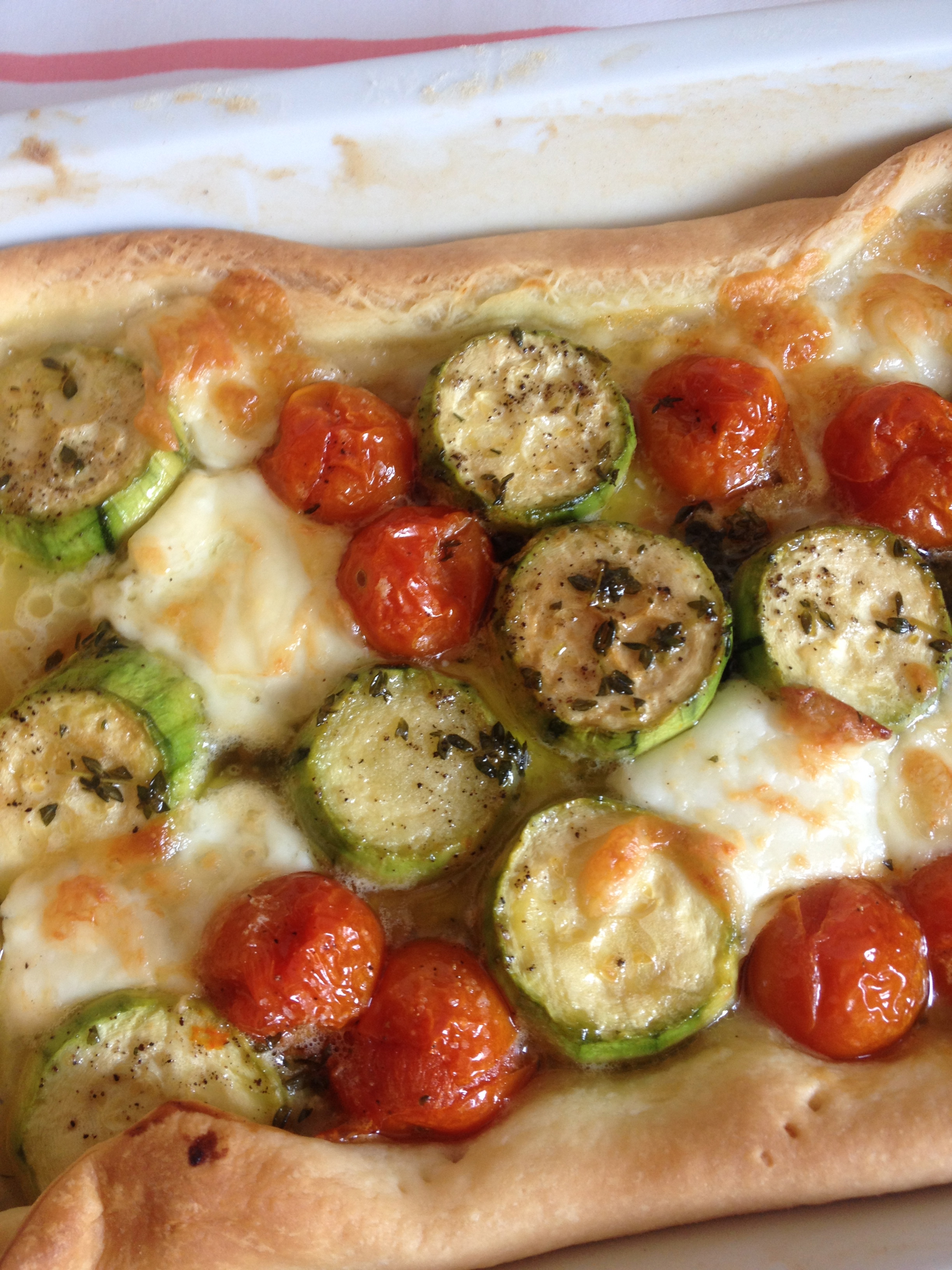 Pon una sartén al fuego y cuando esté caliente añade el aceite, la mantequilla, la miel y el tomillo. Añadimos los calabacines cortados en rodajas de 2 o 3 cm de grosor y rehogar a fuego medio hasta que estén un poco tiernos. Después echar los tomatitos y darles unas vueltas. Sazonar con sal y pimienta. Distribuir los calabacines con todo el jugo por encima, añadir el queso, salpimentar de nuevo y rociar con todo el jugo de la sartén.