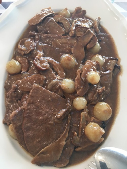 Etiquetado con cebollitas, setas, ternera