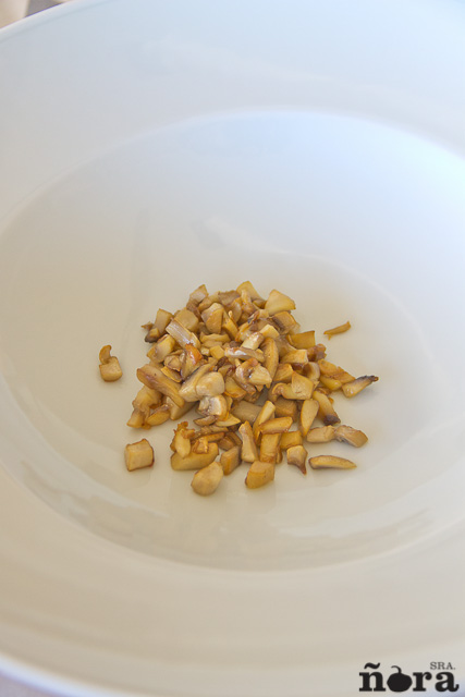 Cuando la crema este preparada limpiamos los champiñones y los cortamos en dados pequeños; ponemos un chorrito de aceite en la sartén y los salteamos.