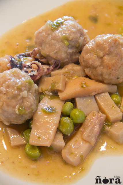 Los platos en los que intervienen juntos carnes y pescados suelen dar buen resultado; la mezcla de sabores, bien condimentados, hace que guste a la mayoría de los comensales. Es un plato de fácil preparación aunque tiene su trabajo y por ello os lo recomiendo para un día especial. Es probable que tengáis un carnicero de mucha confianza que pueda preparaos las albóndigas, en cuyo caso el trabajo se hace mas liviano.