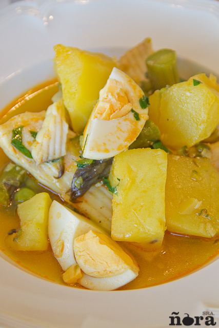 Pon el aceite en una cazuela. Una vez caliente sofreír la cebolla, con los ajos y el pimiento. Cuando este bien pochada la verdura añadimos las patatas, les damos unas vueltas e incorporamos el pimentón y, sin dar tiempo a que se queme, añadimos el vino. Evaporamos el alcohol y añadimos el caldo, salpimentamos y añadimos las especias. Hervimos a fuego medio unos 7 minutos para a continuación añadir los espárragos y los guisantes y lo dejamos cocer a fuego suave otros 7 minutos mas. Cuando vayamos a comer levantamos el fuego, añadimos la raya y bajamos de nuevo el fuego, cocemos 3 minutos y dejamos reposar otros tres con el fuego apagado. Pasado este tiempo añadimos el huevo cocido cortado en cuatro y espolvoreamos un poco de perejil. Tendremos nuestro guiso listo para disfrutarlo.