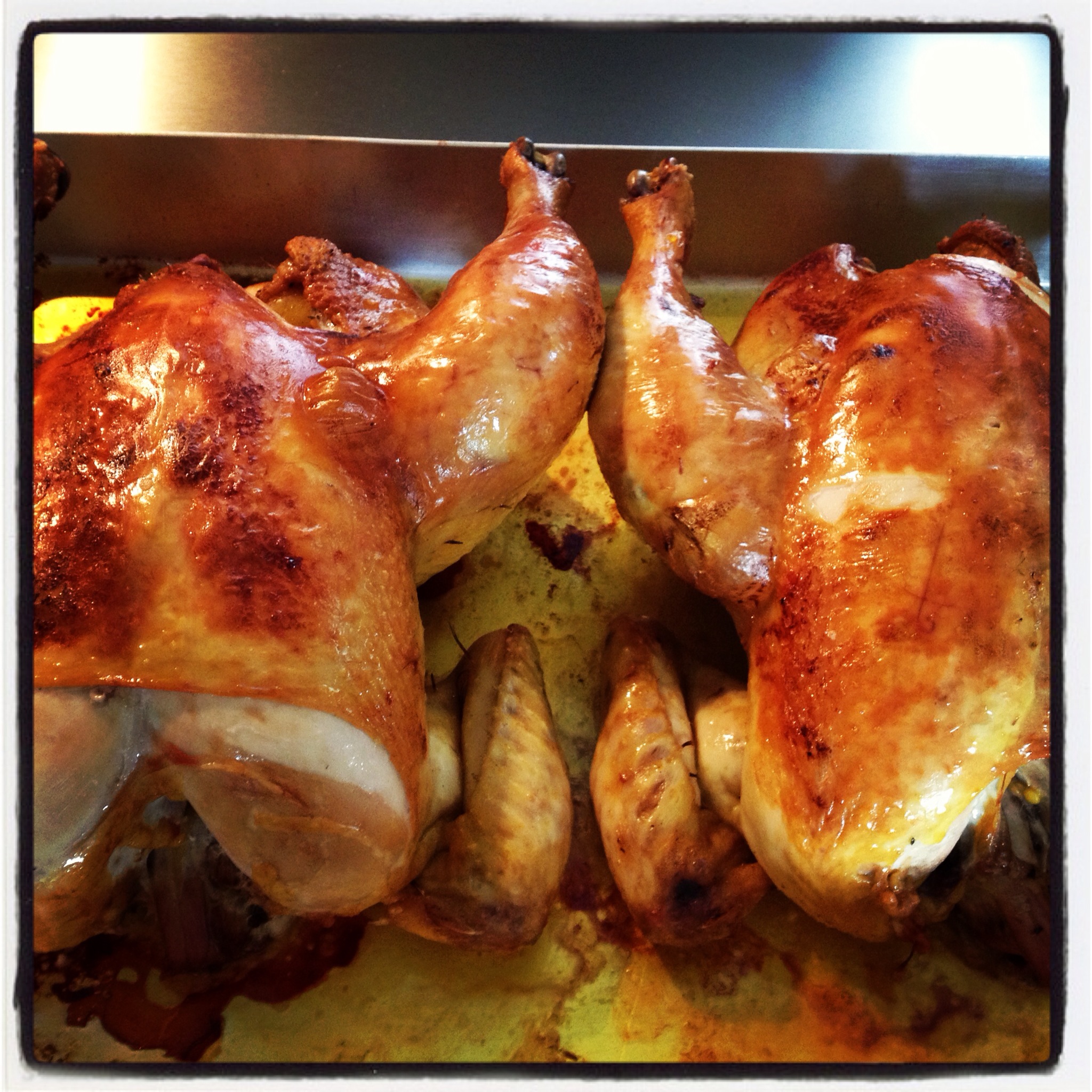 Asé dos pollos. Unos pollos espectaculares de El Pavero, en Orihuela, mi tierra natal. De lo único que me arrepentí es de no haber dejado uno de los pollos sin la salmuera inyectada como espécimen de control.